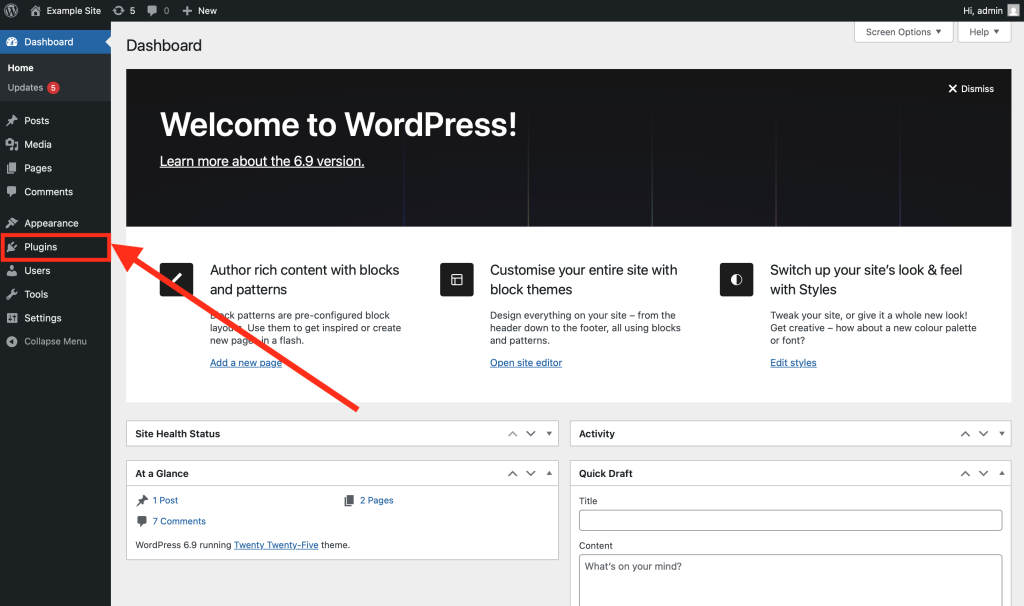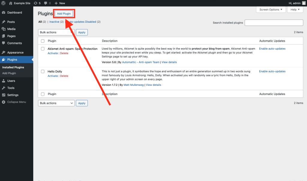 Step 1: To begin, login to your admin dashboard and navigate to the ‘Plugins’ page.