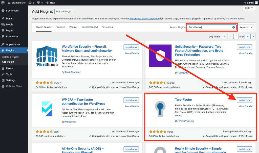 Step 2: Once on the plugins page, click the ‘Add Plugin’ button to access the plugin directory. Then, type ‘Two-Factor’ into the search box before hitting the ‘enter’ — i.e. ‘return’ — key on your keyboard.
