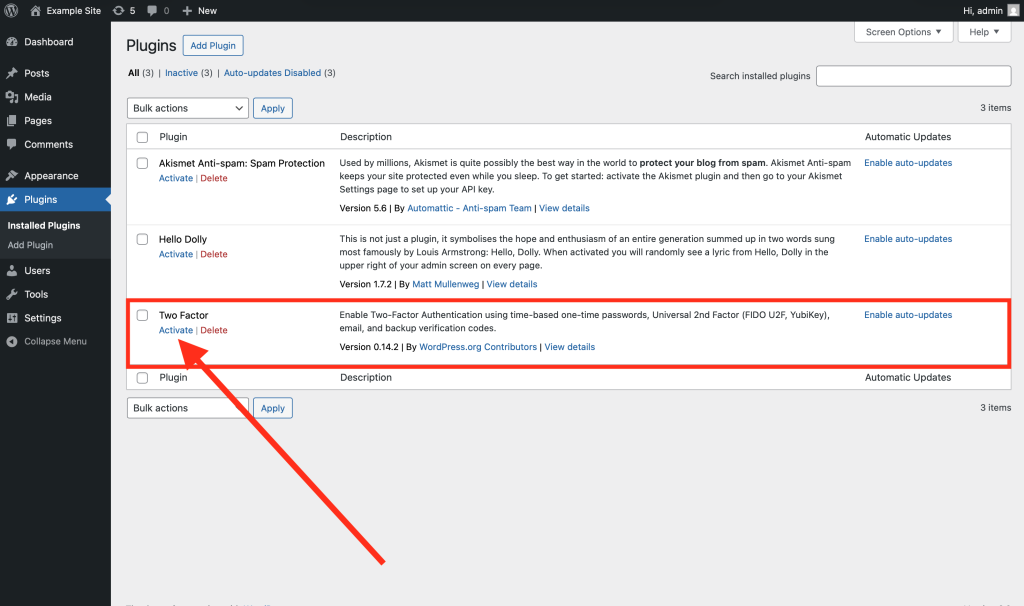 To add 2FA to the WordPress login flow, we will use the ‘Two-Factor’ plugin. The plugin is available on the WordPress Plugin Directory, and is developed by WordPress.org contributors. It provides four useful 2FA methods: