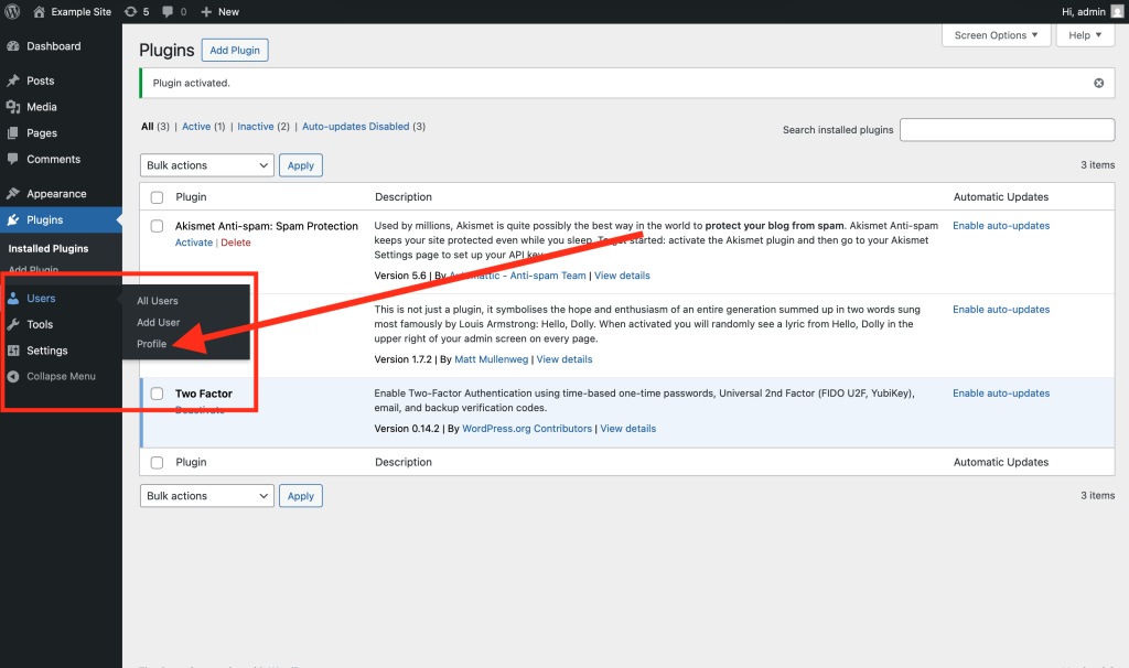 Step 5: Now that the plugin has been activated, you can configure two-factor authentication for your user account. This configuration is performed from your user profile settings, which can be accessed by hovering over the ‘Users’ tab in the sidebar, and selecting ‘Profile’ — alternatively, you could simply navigate to the ‘Users’ page and select your user account from the list.