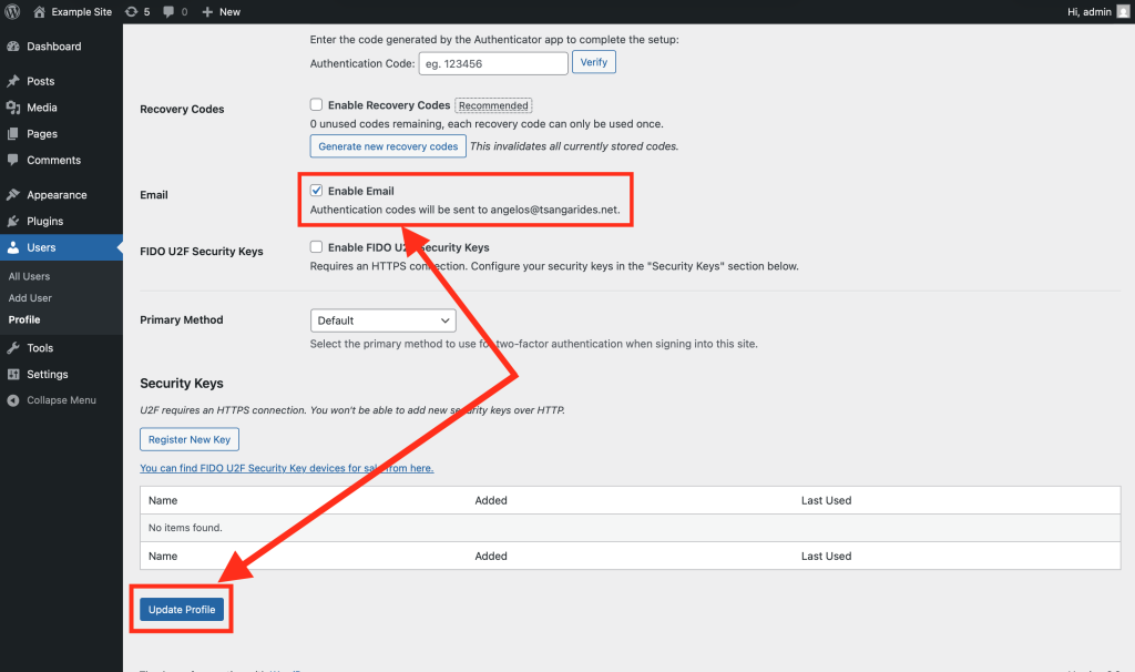 For demonstration purposes, I will simply enable the e-mail codes method. You can do this by ticking the ‘Enable Email’ checkbox. Once you have done this, click the ‘Update Profile’ button at the bottom of the page to save your changes.